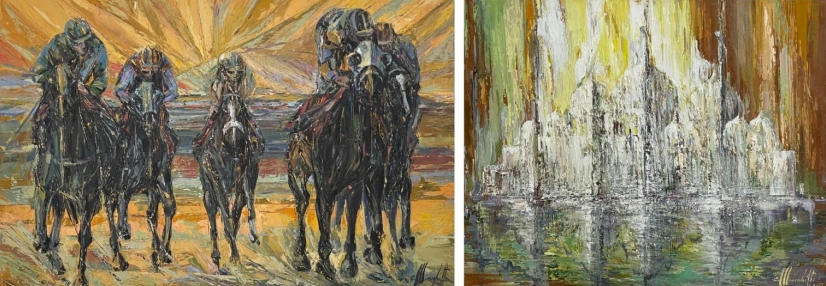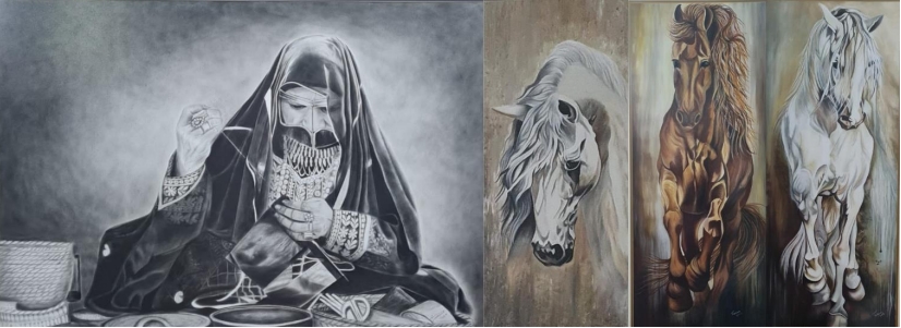 Tamara’s paintings celebrate the essence of Emirati heritage and resilience. Humble Culture portrays a beautiful Arabian lady adorned in vibrant, intricately embroidered attire, reflecting the rich traditions of the desert lifestyle. Her modesty, hospitality, and skilled craftsmanship symbolize the enduring spirit of Emirati culture, blending tradition and modernity. The Three Knights honors the cultural significance of Arabian horses, embodying strength, nobility, and wealth. Once vital for survival in the desert, these majestic creatures are now celebrated through endurance racing and festivals. Together, the artworks pay tribute to the timeless connection between the Emirati people, their traditions, and nature.
