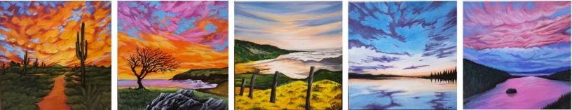 Her five paintings collectively celebrate nature’s profound harmony and beauty, each capturing a fleeting moment of transition and reflection. From tranquil twilight skies alive with swirling clouds to sunsets ablaze with fiery hues mirrored in serene waters, they evoke a sense of awe and calm. The interplay of warm and cool tones, balanced between earth and sky, reflects the resilience and interconnectedness of life. Whether it’s a serene river, a desert sunset, or rolling hills, each scene invites the viewer to journey into landscapes of infinite tranquillity, where nature’s elements unite to inspire hope, peace, and a deeper connection to life’s essence.