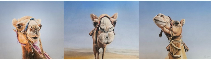 Lucinda's captivating camel portraits beautifully encapsulate the profound connection between these majestic creatures and Arab culture. Each artwork tells a story: one celebrates the camel's unique beauty and expressive charm, evoking curiosity and quiet confidence; another reflects their inquisitive, gentle nature, embodying their loyal companionship and historic significance as symbols of pride and heritage; while the third delves into the camel's noble bearing, mirroring the grace and dignity inherent in Arab identity. Together, these paintings weave a narrative of reverence, illustrating how camels have profoundly influenced cultural values, bridging history and tradition with artistic wonder.