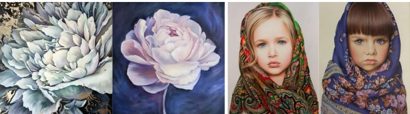 Vasilisa’s floral paintings beautifully reflect on life’s fleeting yet profound nature. The close-up painting draws us into the intricate heart of a bloom, revealing textures and patterns that celebrate the beauty found in life’s smallest, often overlooked moments. In contrast, the full floral view portrays a vibrant harmony of blossoms, symbolizing life’s interconnectedness and cyclical renewal. Together, these works evoke a deep emotional resonance, inviting viewers to reflect on impermanence and the transient nature of beauty. Vasilisa’s art transforms flowers into metaphors for life’s fragility and splendor, reminding us to cherish both the intimate and the expansive moments of existence.